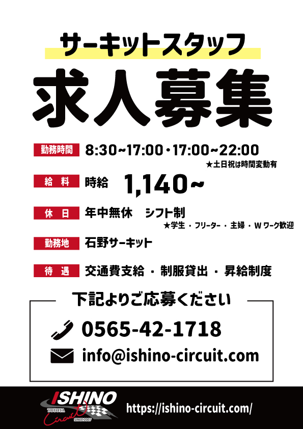 求人情報 2025年10月1日 by デジコロボプラス 求人情報情報 ISHINO CIRCUIT 求人情報 サーキットスタッフ 募集中♪ 石野サーキットで一緒に働いてくれる方募集中日常生活では体験する事の無い「サーキット」でのお仕事モータースポーツが好きな方、車・バイクが好きな方には超オススメです♪ 仕事内容 サーキット業務全般走行前の説明・走行監視・接客・レース中の旗振り・受付などがメインとなります。走行が無い時はコース清掃やカートを拭いたり等の軽作業あり主なシフト①8:30~17:00 ②17:00~22:00 その他相談ください。 必ずご確認下さい。応募方法について Japan お名前(漢字) ※必須 お名前(ひらがな) ※必須 性 別 男女 ※必須 生年月日 ※必須 年 齢 ※必須 電話番号 ※必須 郵便番号 ※必須 都道府県 市区町村 番地・建物名 現在の状況 ※必須 応募者メールアドレス ※必須 応募者情報 (任意) 上記の内容でよろしければ、送信ボタンをクリックしてください。